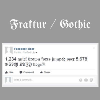 Fraktur, blackletter, old English, or gothic text is a style of text script used for European languages beginning in the 12th century. This style is now mostly used for decorative purposes, for example, to evoke an old word classical feel. It can also be used to evoke a heavy metal feeling. This unicode text tool generates Fraktur style black letter text that can be copied into Facebook and Twitter messages, YouTube comments, SMS messages, etc.