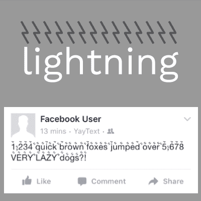 This tool uses unicode to put lightning symbols on top of your text (l͛i͛k͛e͛ ͛t͛h͛i͛s͛!͛). You can copy this lightning text into Facebook status messages, tweets, and text messages. You can use lightning text to make your text look loud, crazy, intense, or stormy. ⚡