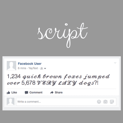 This tool generates formal, flowing, script text (𝓁𝒾𝓀ℯ 𝓉𝒽𝒾𝓈) that can be copied/pasted into Facebook status messages, Twitter updates, YouTube comments, etc. This script style text can be used to recreate the human-ness of handwritten text, or to imitate formal calligraphy.