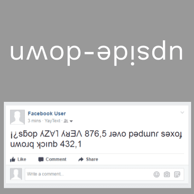 This tool generates upside-down text (sıɥʇ ǝʞıן) that you can copy and paste into Facebook statuses, tweets, YouTube comments, and more. Flipping words upside-down is a fun trick you can use to make people laugh and see things from a new perspective. Upside-down text can be used to denote crazy ideas, silliness, or uniqueness 🙃.